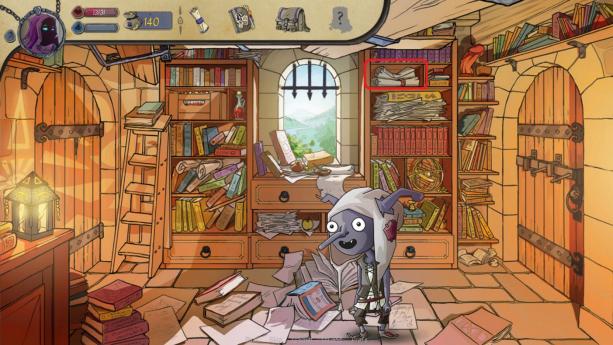 — The stack of scrolls at the top right next to the windows [Bird Watching Manual]