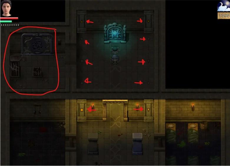 Upon returning to the tower, you find Erevi and her daughter in the shrine. Her daughter is giving birth. It soon dawns on you that this “baby” has some extraordinary feeding needs. Erevi knows of an artifact developed by the Ancients that may be of help. She asks you to accompany her to the Ancient Temple (ruins to the east of the goblin forest) to search for such an artifact. Search the temple for clues. There is a secret control room in the temple that can be opened by aligning symbols on the pillars (2 pillars in each of the three central rooms) with the symbols on the floor.